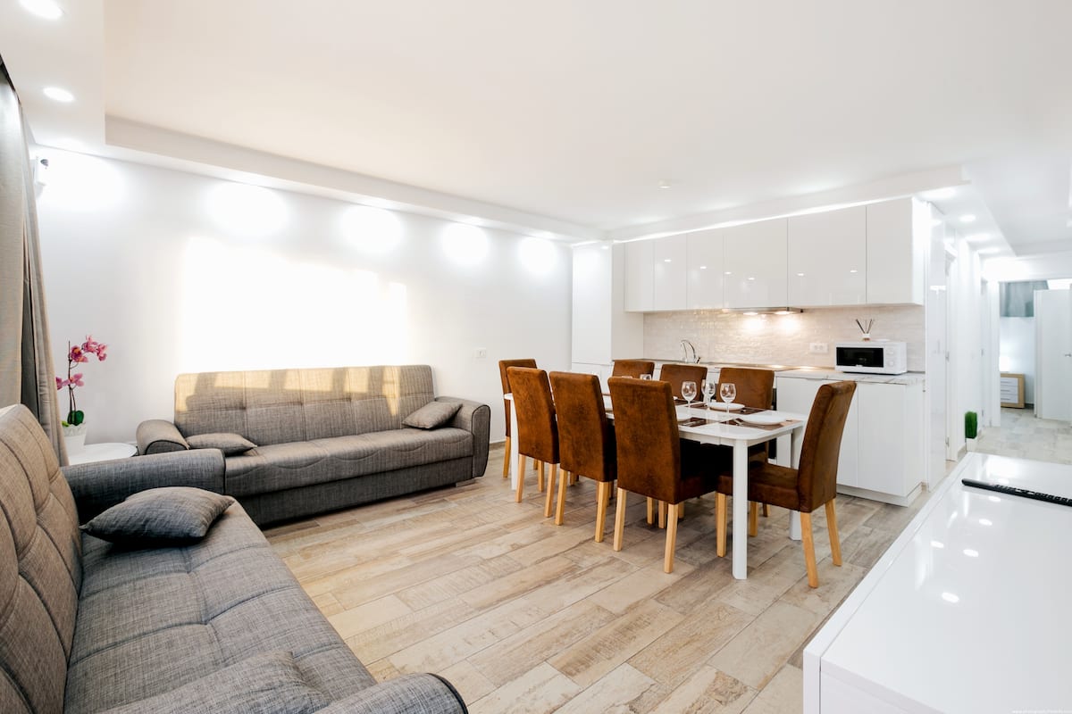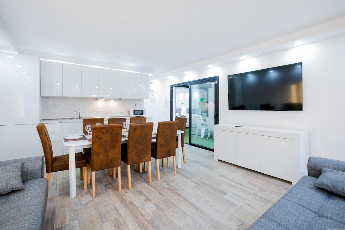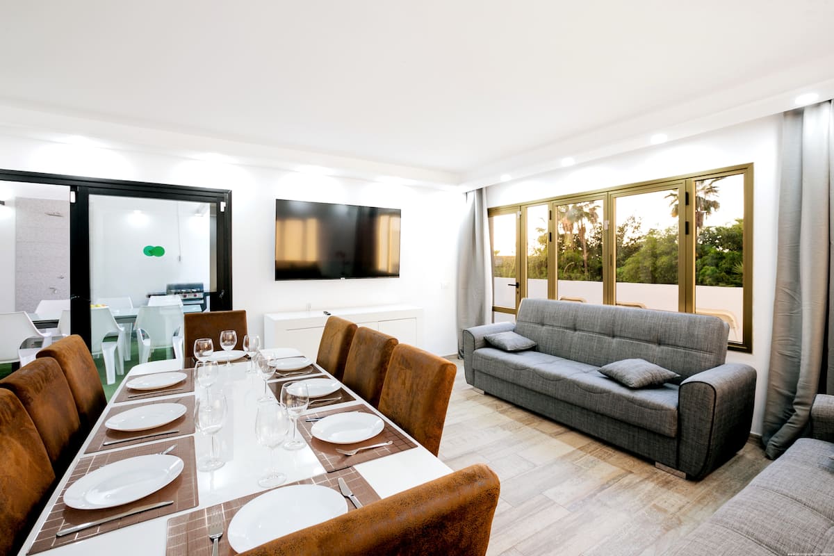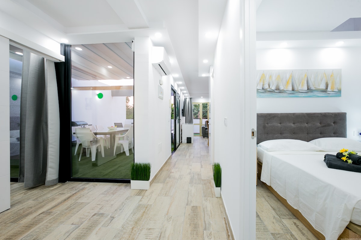 Este alojamiento con estilo es perfecto para viajes en grupo y en familia porque tiene plazas para 8 personas y una terraza de 70mq con barbacoa. WIFI, cocina equipada, posición céntrica, cerca de todos los servicios, restaurantes y bares. Se llega a la playa en 10 minutos andando y si lo necesitan tiene plaza de garaje. No hay piscina en el complejo porque podrán disfrutar de todas las piscinas del Aqualand, que está justo en frente.
