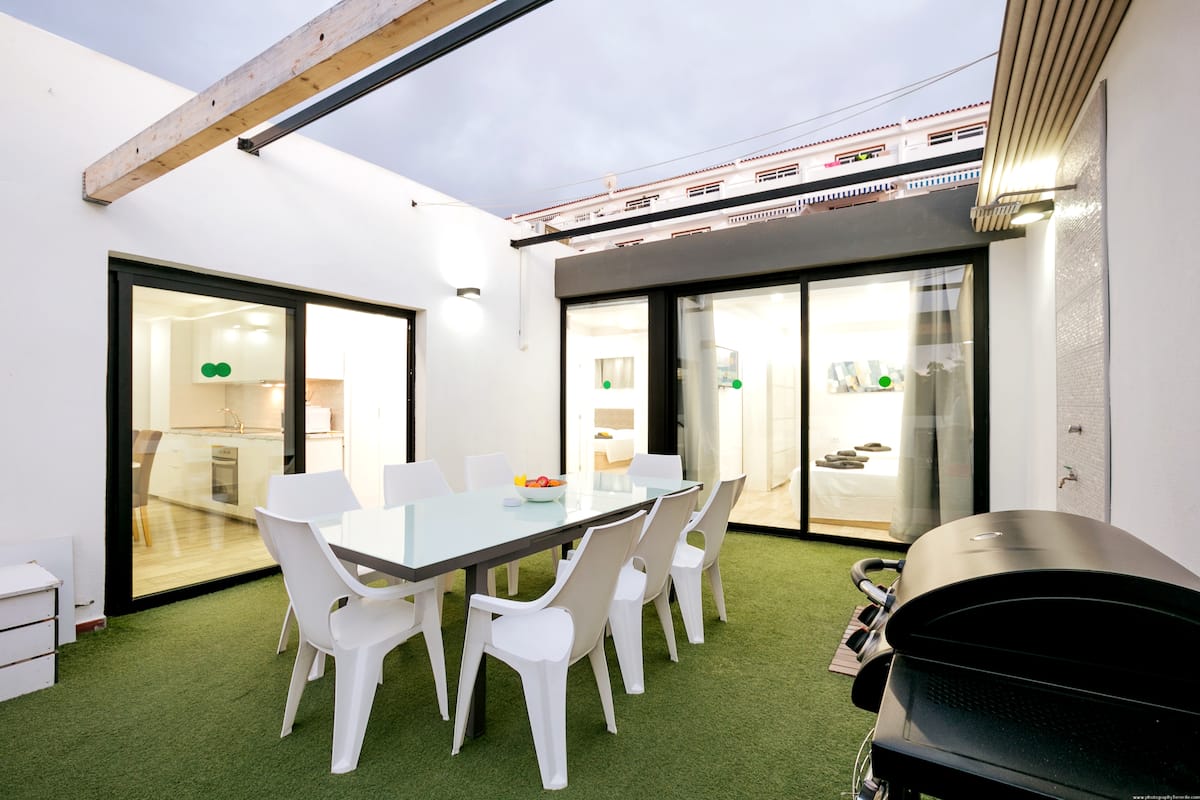 Este alojamiento con estilo es perfecto para viajes en grupo y en familia porque tiene plazas para 8 personas y una terraza de 70mq con barbacoa. WIFI, cocina equipada, posición céntrica, cerca de todos los servicios, restaurantes y bares. Se llega a la playa en 10 minutos andando y si lo necesitan tiene plaza de garaje. No hay piscina en el complejo porque podrán disfrutar de todas las piscinas del Aqualand, que está justo en frente.